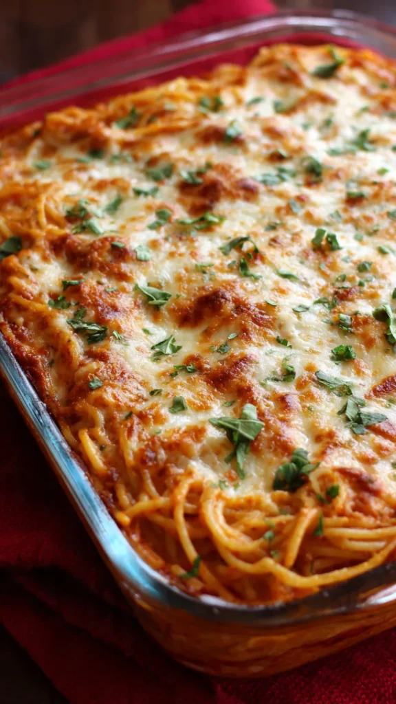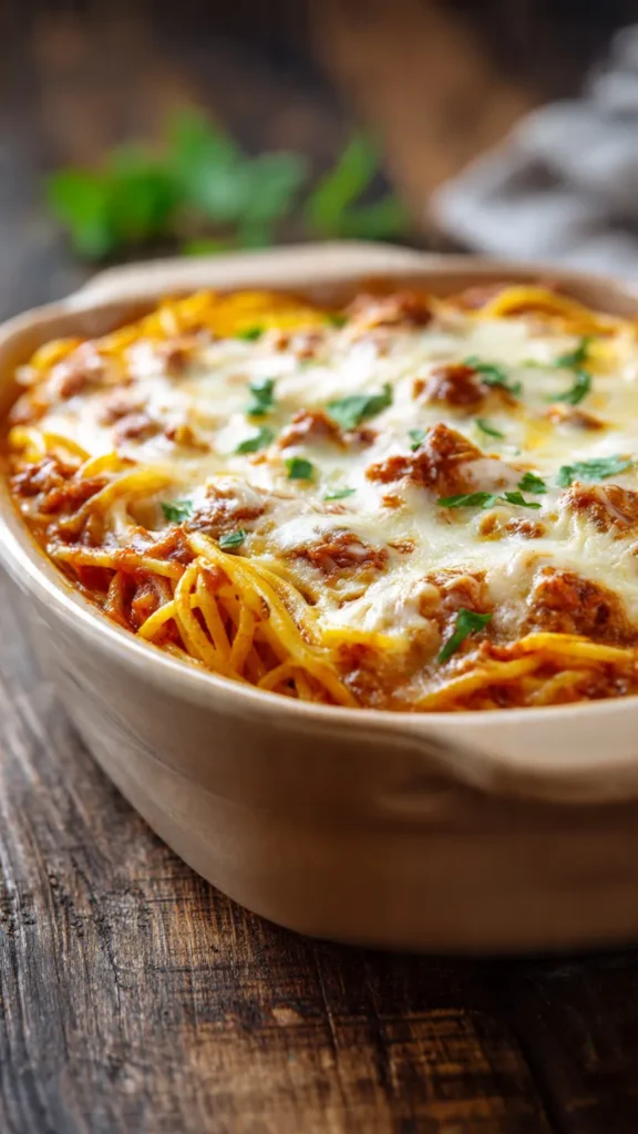 Baked Cream Cheese Spaghetti Casserole is a beloved Southern comfort food that has become a staple in American home cooking, particularly popular in church potlucks and family gatherings. This recipe represents a brilliant fusion of Italian-American pasta traditions with the Southern love of cream cheese in casseroles, creating something uniquely delicious. The addition of cream cheese to spaghetti casseroles likely originated as a way to add richness and creaminess without the fussiness of making a traditional béchamel sauce, making it accessible to home cooks of all skill levels. The tangy flavor of cream cheese balances the acidity of tomato sauce beautifully while creating an incredibly luscious texture that’s different from traditional baked spaghetti or lasagna. Many families have passed down their own versions through generations, with some adding cottage cheese or ricotta for extra protein, others incorporating sour cream for additional tang, and some topping with French fried onions for crunch. This casserole is particularly beloved because it reheats exceptionally well, often tasting even better the next day after the flavors have had time to meld together. The one-dish nature makes it perfect for busy families—you can assemble it in the morning, refrigerate, and bake it when you get home for a hot, satisfying dinner with minimal effort. It’s also endlessly adaptable, working equally well with ground turkey, Italian sausage, or as a vegetarian dish loaded with vegetables.