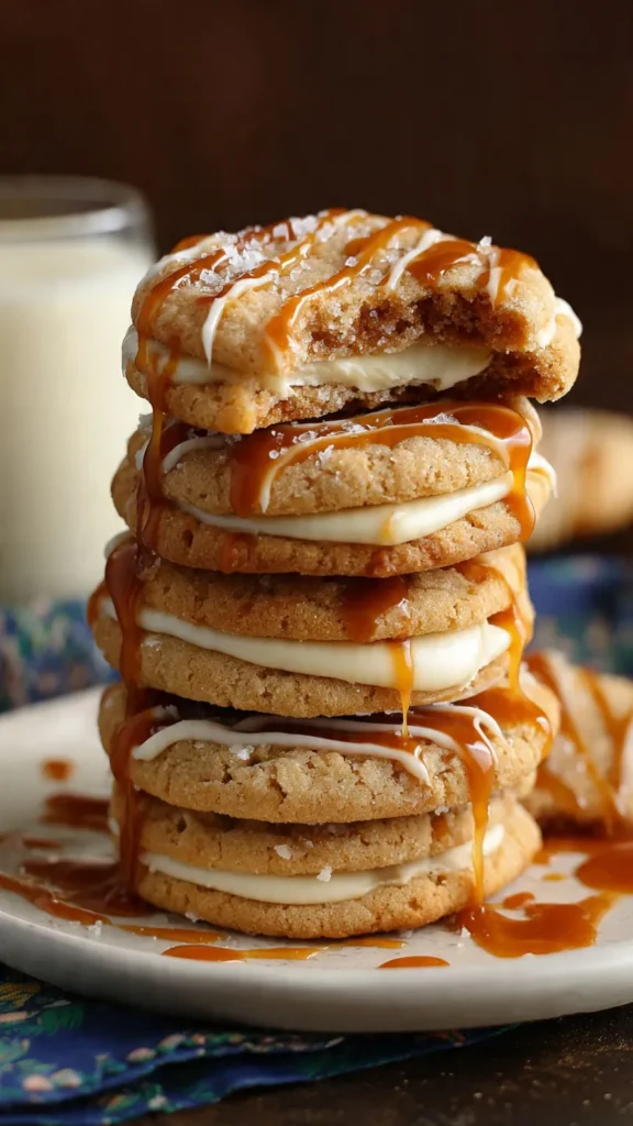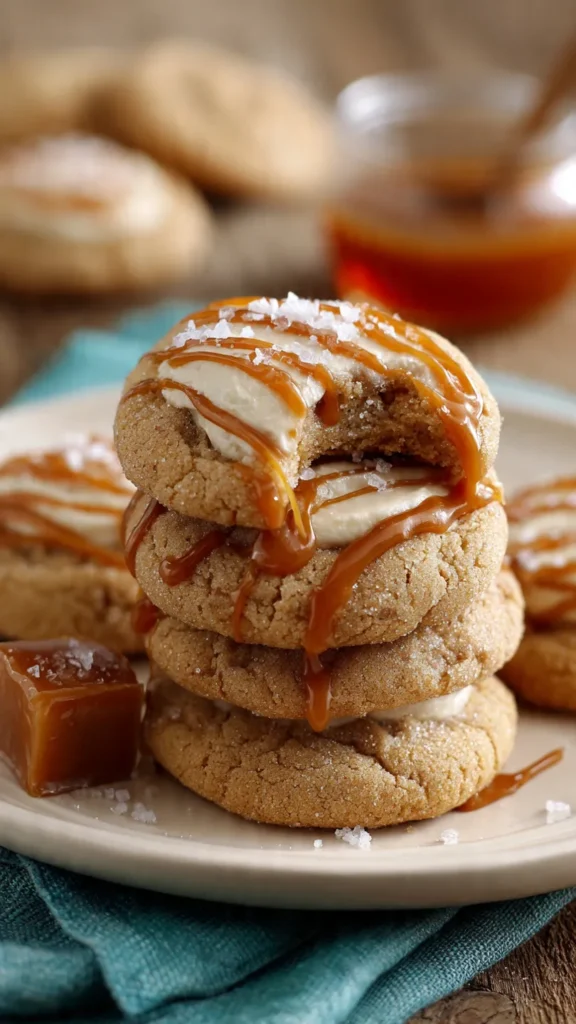 Caramel Cheesecake Cookies gained massive popularity thanks to Crumbl Cookies, which features rotating weekly flavors including their iconic Salted Caramel Cheesecake Cookie. The original Crumbl version inspired countless home bakers to create copycat recipes that replicate the bakery’s signature oversized cookies with gourmet toppings. The combination of graham cracker cookies with cheesecake and caramel pays homage to classic cheesecake flavors—graham cracker crust, creamy filling, and caramel topping—all reimagined in portable cookie form. The stuffed variation, which features frozen cheesecake filling inside the cookie, represents the trend toward “surprise center” cookies that became popular on social media in the 2010s and 2020s. Today, these cookies represent the evolution of American baking toward bakery-quality treats made at home, with emphasis on multiple components, bold flavors, and Instagram-worthy presentation.