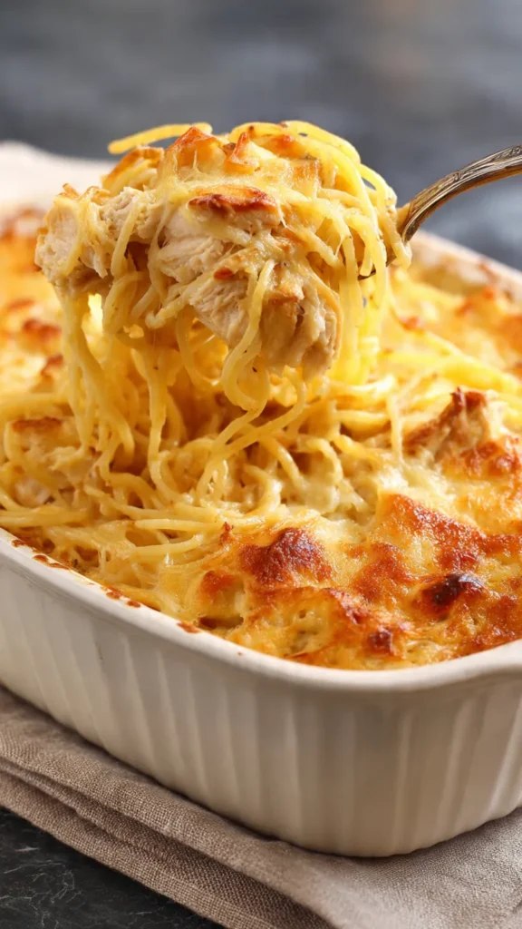 Creamy, cheesy baked spaghetti loaded with tender chicken and baked until golden and bubbly—perfect for family dinners and potlucks.