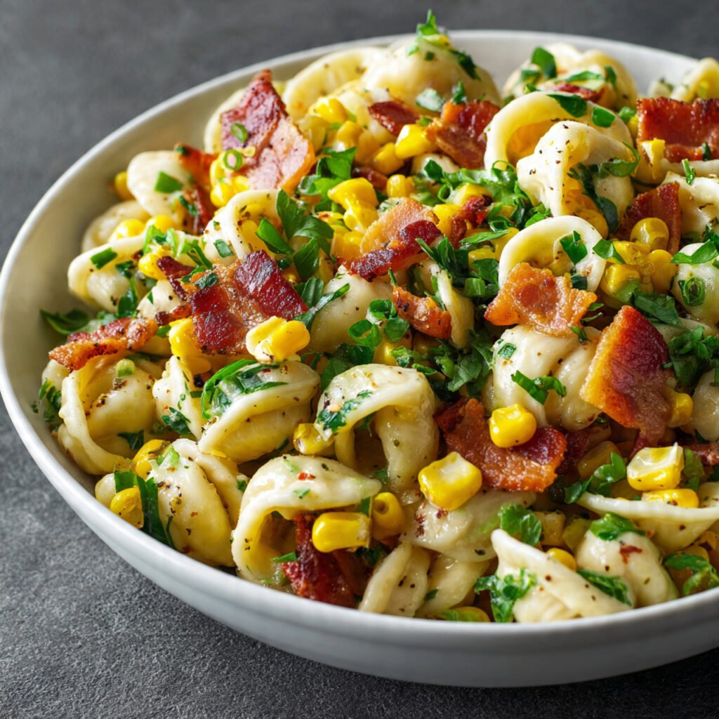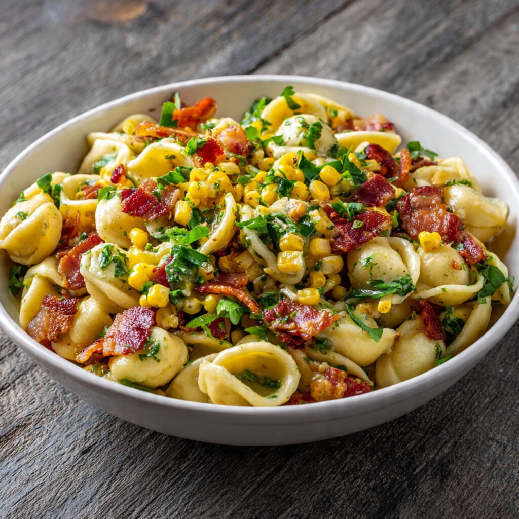 Corn Pasta Salad with Bacon and Creamy Pesto Dressing