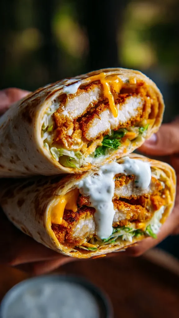 There’s something magical about biting into a perfectly golden tortilla that’s been grilled to crispy perfection, revealing layers of tender fried chicken, melted cheese, and cool ranch dressing inside. This Fried Chicken Burrito Wrap brings together everything we love about comfort food—the crunch of fried chicken, the gooey satisfaction of melted cheese, and the refreshing contrast of crisp vegetables—all wrapped up in one handheld meal that’s impossible to resist.