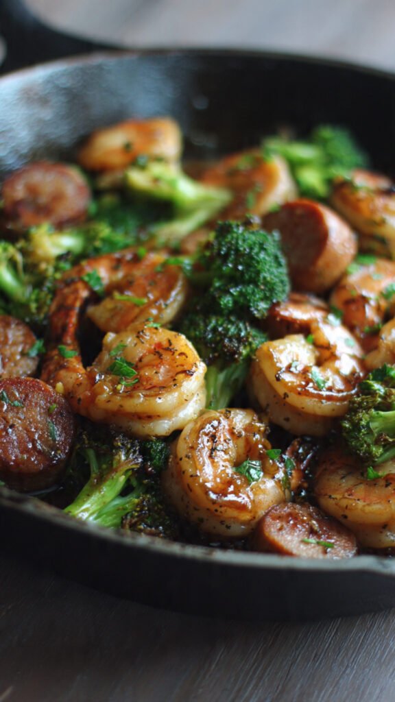 This dish also works beautifully for entertaining. Serve it family-style in a large platter over rice, letting guests help themselves. The vibrant colors—pink shrimp, golden sausage, green broccoli, and glossy sauce—create an impressive presentation.