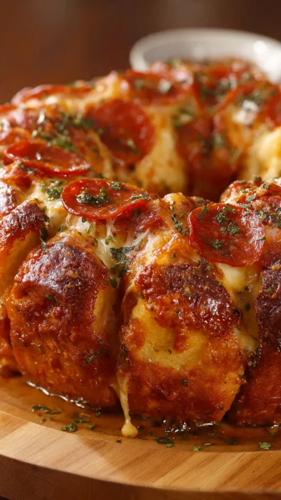 Pizza Monkey Bread is a brilliant fusion of traditional sweet monkey bread and everyone’s favorite food—pizza. This savory adaptation gained popularity as a party appetizer because of its interactive, pull-apart nature that encourages sharing and makes eating fun for both kids and adults. The use of refrigerated biscuit dough is what makes this recipe so accessible and quick—eliminating the intimidation factor of working with yeast dough while still delivering that soft, pillowy texture. The Bundt pan shape is not just decorative; it allows the heat to circulate evenly around the center tube, ensuring the dough cooks through while creating those beautiful ridges that hold extra cheese and pepperoni. Some creative variations include stuffing each piece of dough with cheese and pepperoni before layering, which creates pockets of melted goodness when you pull the bread apart. The seasoned butter mixture is key to achieving authentic pizza flavor—the combination of garlic, Italian herbs, and olive oil mimics the flavors of classic pizza crust. This recipe has become a game day favorite alongside other crowd-pleasers because it can be eaten with your hands, requires no utensils, and stays warm for a good amount of time, making it ideal for buffet-style serving.