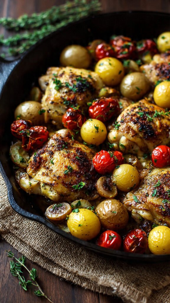 What makes this recipe particularly special is its simplicity. Despite delivering restaurant-quality results, it requires minimal prep work and uses just one pan. The bone-in, skin-on chicken thighs become wonderfully crispy on the outside while staying juicy and tender inside, while the baby potatoes soak up all those delicious Mediterranean flavors as they roast alongside the chicken. It’s the perfect weeknight dinner that feels special enough for company.