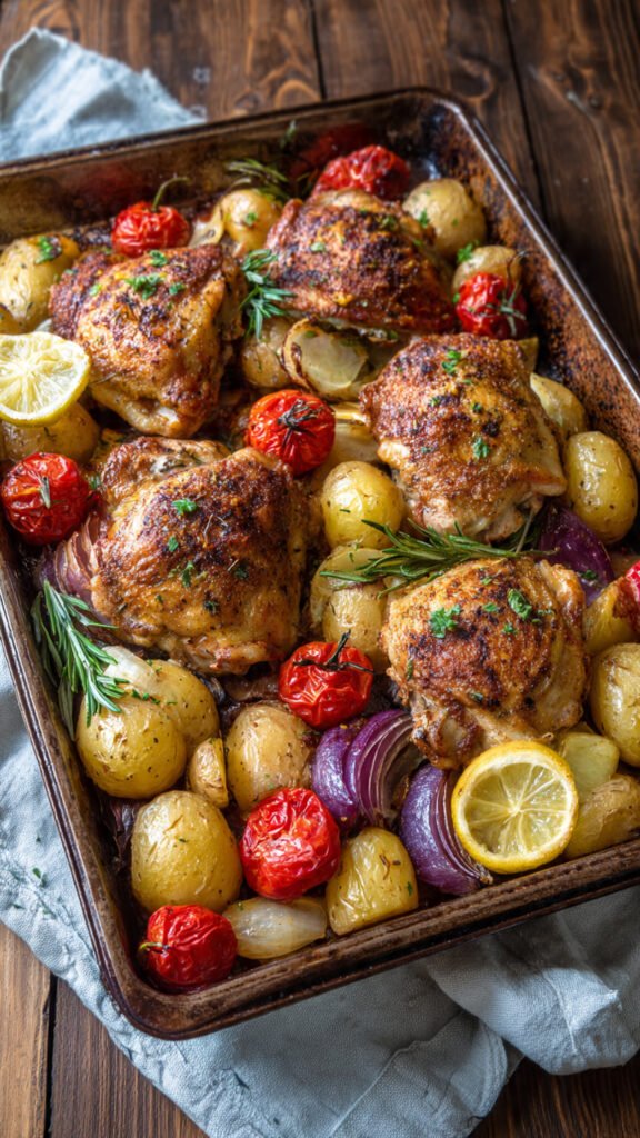 There’s something truly magical about the combination of perfectly roasted chicken and golden, crispy potatoes. When you infuse this classic pairing with the vibrant flavors of the Mediterranean—aromatic herbs, bright lemon, and fragrant garlic—you create a dish that’s both comforting and exciting. This Roasted Mediterranean Chicken Thighs & Baby Potatoes recipe is the kind of meal that makes your kitchen smell incredible and brings everyone to the table with eager anticipation.