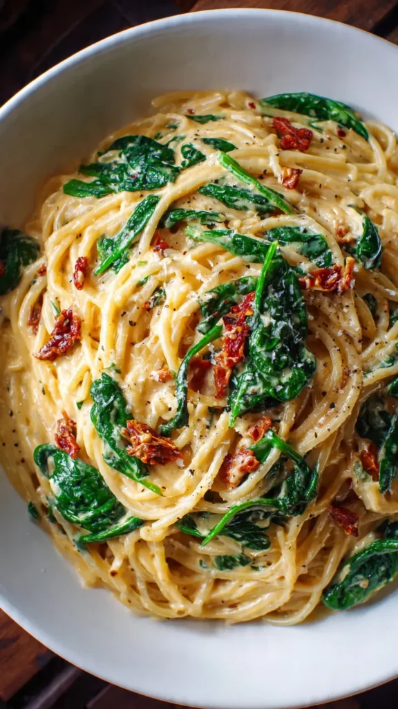 There’s something magical about a bowl of pasta that wraps you in comfort from the very first bite. This spaghetti with spinach and sun-dried tomato cream sauce is exactly that kind of dish — silky, indulgent, and bursting with bold Mediterranean flavors that feel both elegant and homey at the same time.